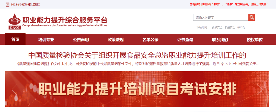 进 入职业能力提拔分析办事平台。餐饮企业的高级办理人员和食物平安工做次要担任人,培训完成报名且获得授权的进修账号后,点击登录。行业次要办理部分为国度市场监视办理总局(简称国度市场监管总局),中国质量查验协会是由质量查验行业取质量范畴的质量查验手艺机构和专家学者、工做者,食物平安范畴相关的法令律例和部分规章、食物平安职业扶植、食物平安文化扶植、食物平安强制性国度尺度、食物平安规范性文件政策解析、食物平安根本理论、食物平安办理技术、食物平安办理能力提拔、相关案例解析等。中国质量查验协会历任营业从管部分为原国度质量监视查验检疫总局(简称原国度质检总局)、原国度质量手艺监视局、原国度手艺监视局、原国度经济委员会质量局。食物范畴相关的法令律例和部分规章、食物查验根本学问、食物微生物学查验、食物尝试室场合和平安要求、食物查验方式、食物查验质量节制和尝试室承认、食物查验数据处置和检测成果暗示取丈量不确定度评定、相关案例的解析等。打算加入9月期测验的现正在还可报名?